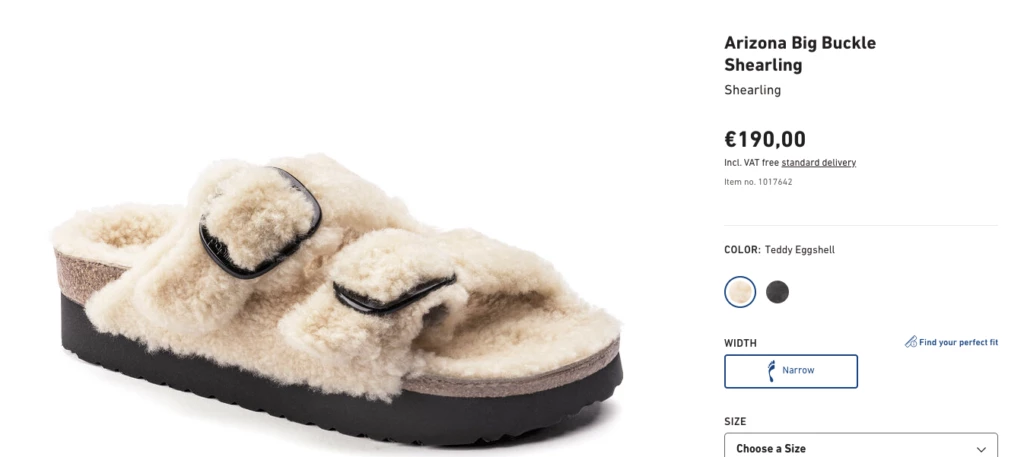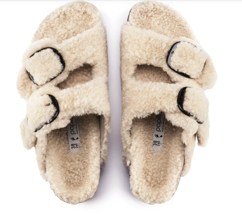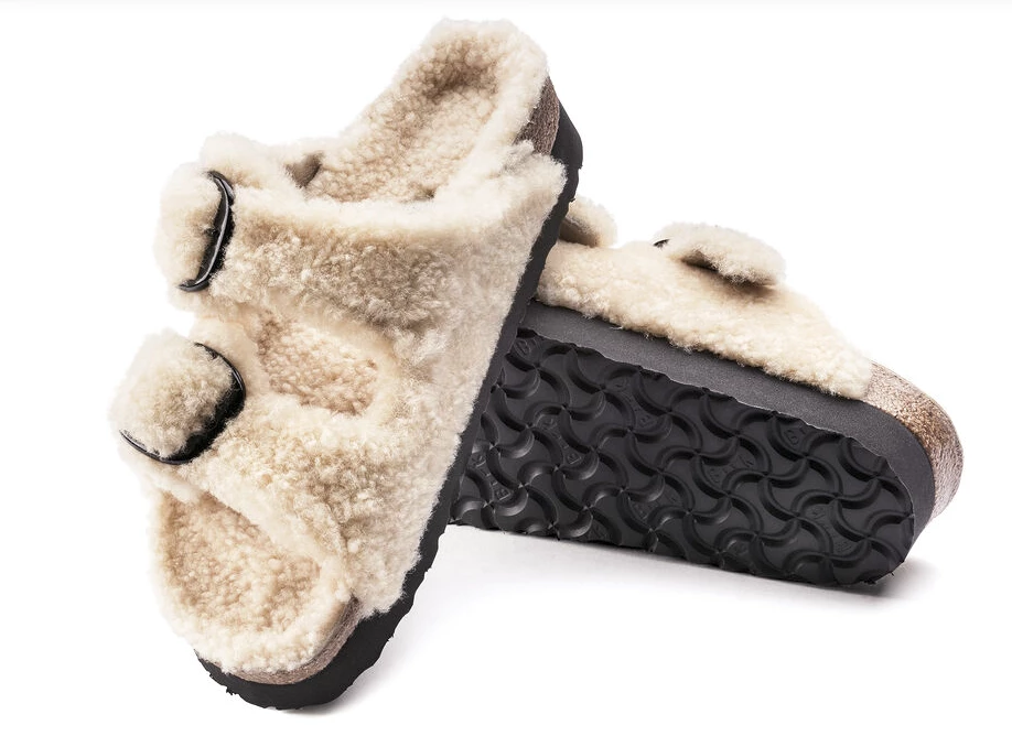 La icónica sandalia de dos tiras modelo Arizona ahora tiene un toque más moderno. Esta nueva versión viene con piel para que los pies se mantengan más calentitos y le de un toque cool a los looks de invierno.