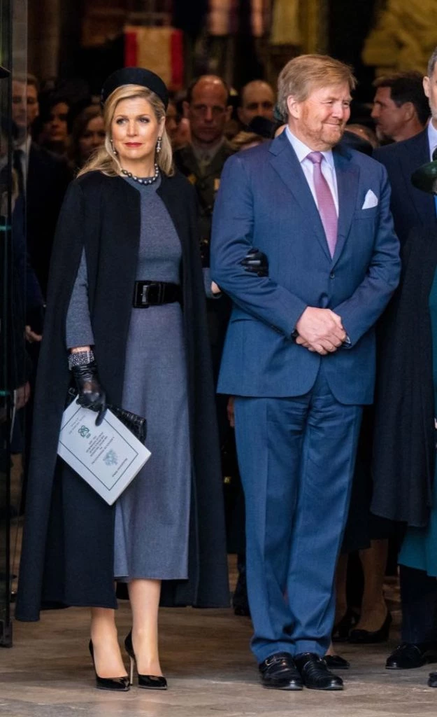 Máxima adoptó a un elegantísimo look en color gris y negro donde su abrigo capa captó todas las miradas. La reina de Holanda llevó un vestido gris de largo midi con magas largas y corte a la cintura y como abrigo sumó una capa larga a los tobillos de color negro.