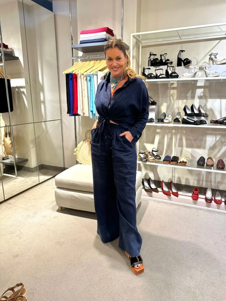 Para la ocasión, la conductora eligió un total look azul con una camisa fluida anudada en la cintura y un pantalón ancho en la misma gama, logrando una silueta estilizada y moderna. El detalle vibrante lo aportó un collar de piedras turquesas, accesorio que ilumina y suma frescura al outfit.