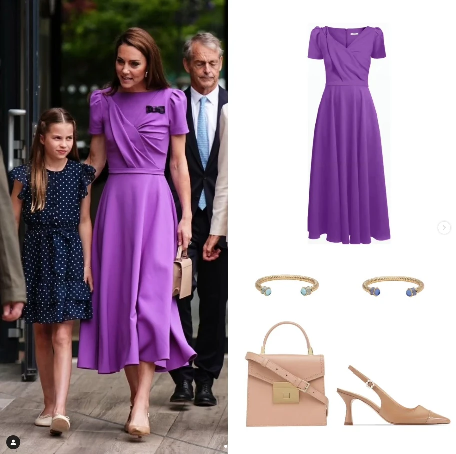 En cuanto a su look, la princesa de Gales llevó un vestido de color lavanda de la marca londinense Safiyaa, de mangas cortas, corte a la cintura y falda levemente evasé, con diseño de frunce en el corsage.
