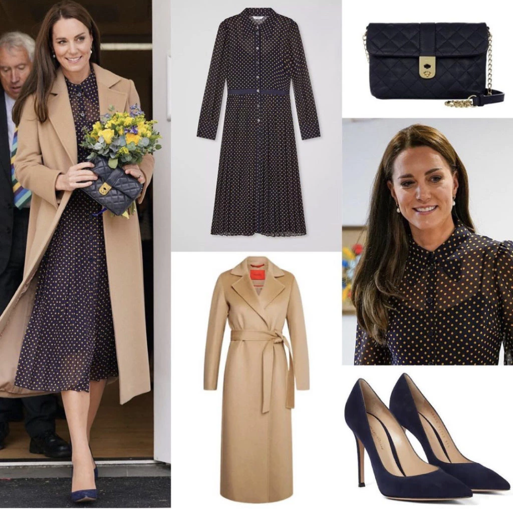 Para visitar el Centro Comunitario de Ucranianos en Reading, Inglaterra, la princesa de Gales llevó un vestido azul con lunares amarillos de LK Bennett, un abrigo camel de paño de Max&Co, clutch negro matelaseado con herraje dorado de Jaeger y stilettos azules de Gianvito Rossi, su calzado preferido. Una vez más Middleton lució espléndida y mostró su apoyo a Ucrania en medio de la guerra con Rusia.