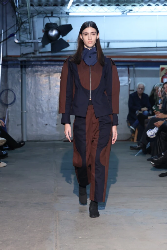 Esa idea se traduce directamente en la construcción de las prendas. Los recursos del círculo y el nudo funcionan como ejes estructurales, generando formas que atraviesan mangas y piernas y que rompen con la rigidez tradicional.