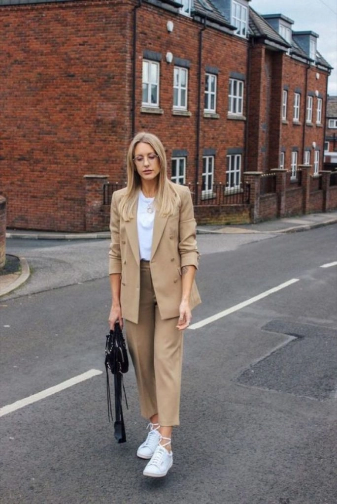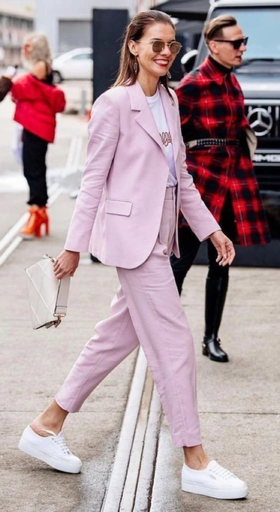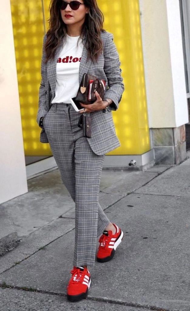 Este combo tan inesperado se convertirá en tu mejor aliado y no te vas a cansar de usarlo. En trajes de tonos neutros podés sumarle un toque diferente y llevar zapatillas de color para que contrasten y marquen la diferencia.