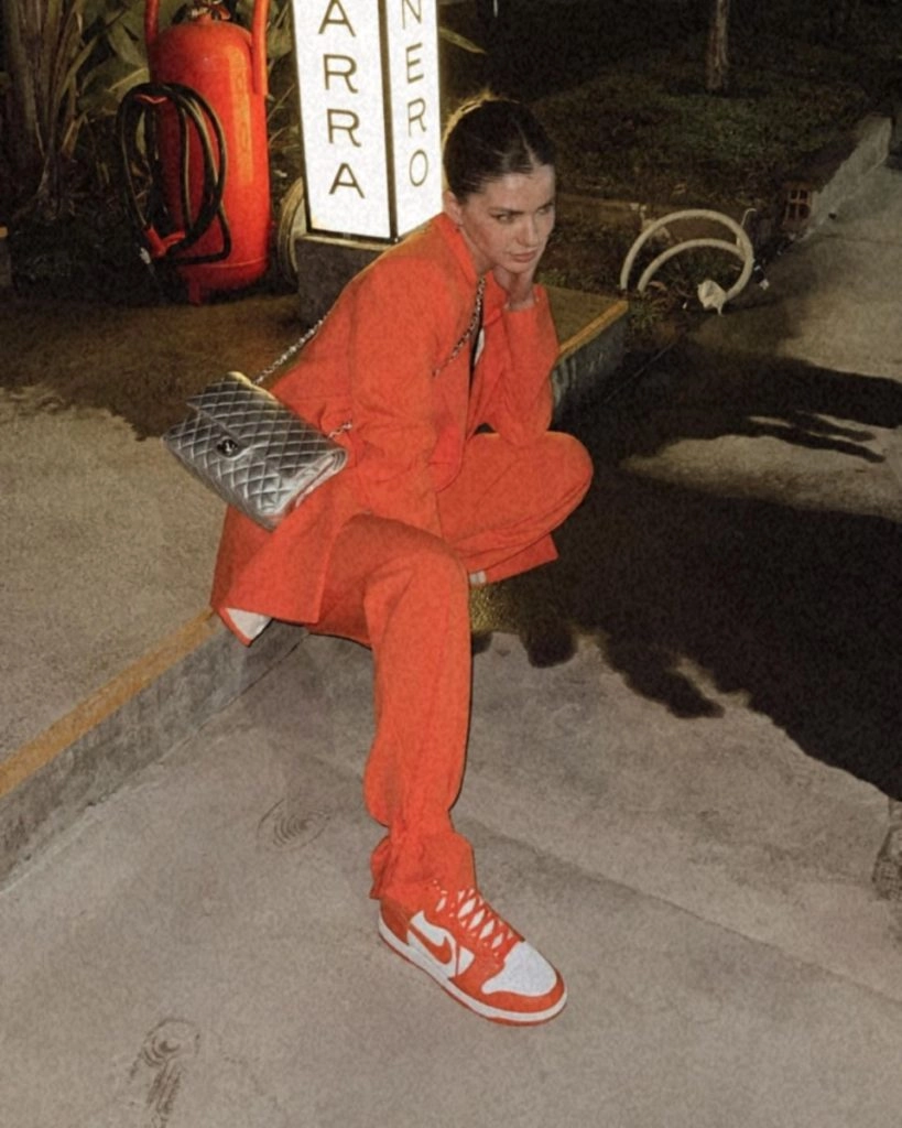 En su último posteo de Instagram, la actriz subió una foto con un outfit muy canchero donde se la ve con una traje de saco y pantalón en color naranja y lo combina con unas zapatillas de basquet al tono y una cartera Chanel metalizada. ¡Un look para copiar y admirar!