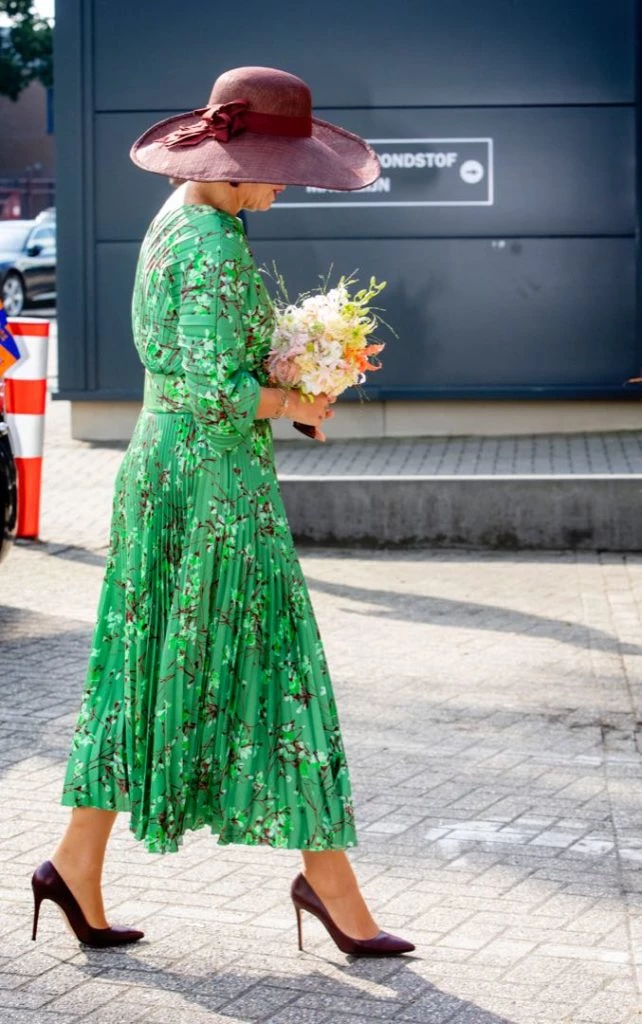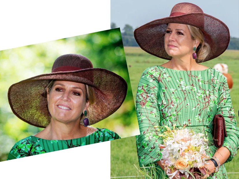 Los sombreros son el accesorio fetiche del guardarropas de la reina de Holanda. Siempre que puede los usa y son los que marcan su distinguido estilo. En este look adoptó una pamela de ala ancha al tono de sus zapatos.