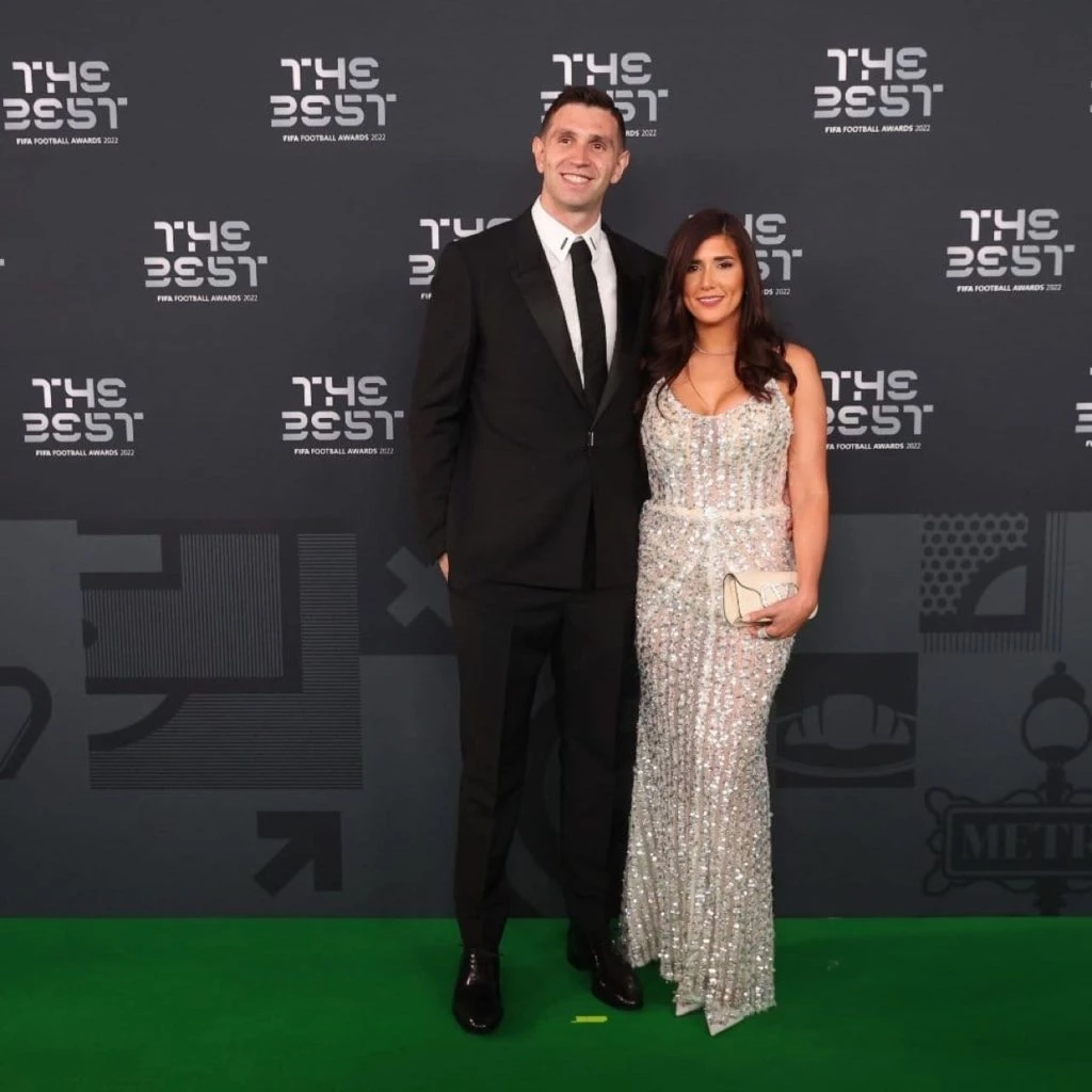 Emiliano Martínez, alias el Dibu, llegó al evento del brazo de su mujer Mandinha. Ambos de estricta etiqueta posaron ante las cámaras muy elegantes y felices.