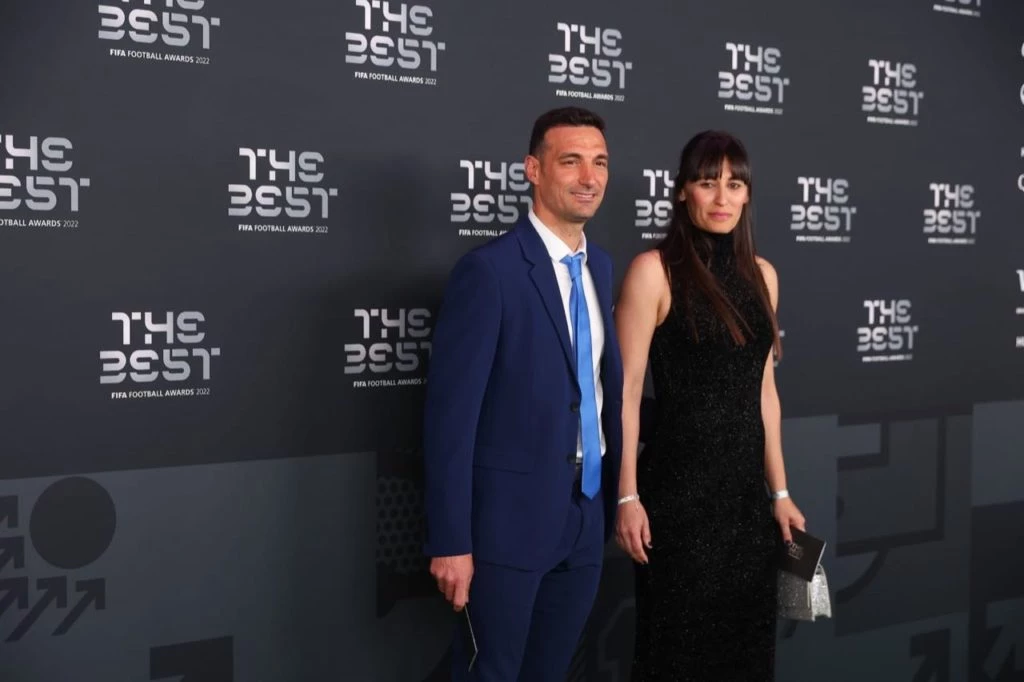 Lionel Scaloni llegó con su esposa Elisa Montero. El DT de la selección argentina llevó un traje de color azul que lo combinó con una camisa blanca y una corbata de seda en color celeste haciendo alusión a la Argentina. Elisa optó por un vestido al cuerpo con brillos. Un diseño son magas , largo al piso y cuello polera. Y lo acompañó con una mini cartera de glitter color plata.