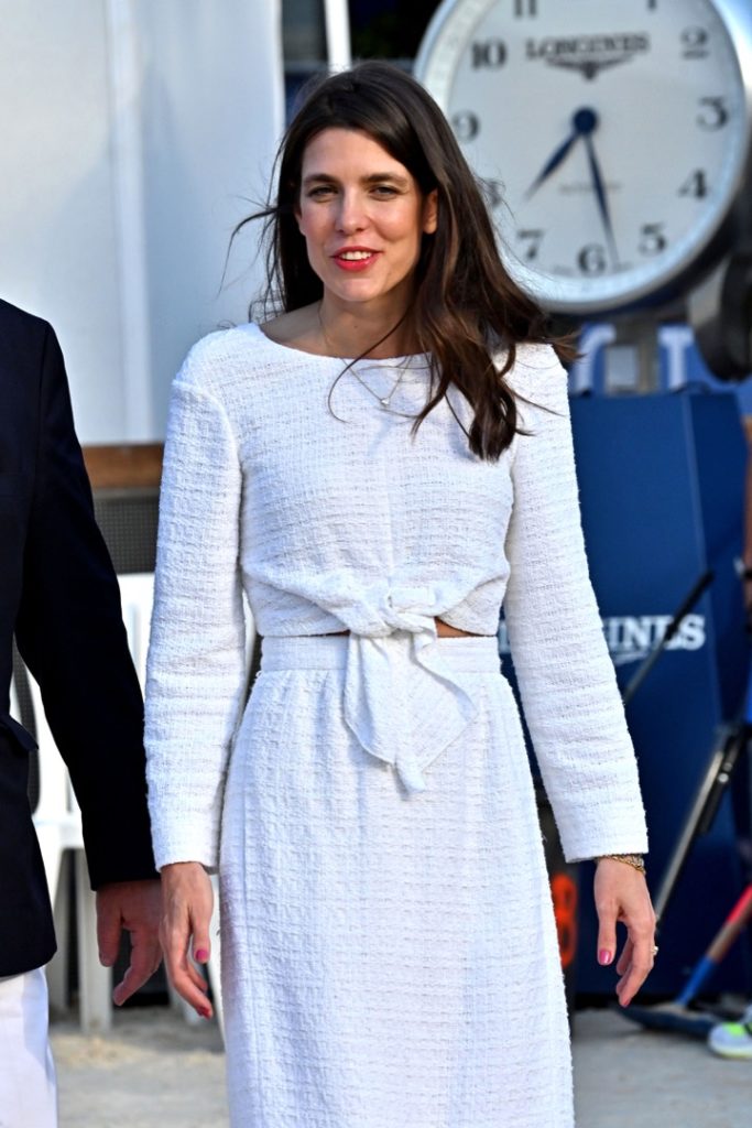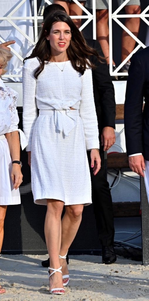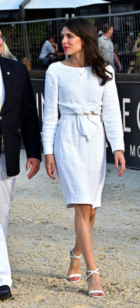 Como embajadora de la casa Chanel, Charlotte llevó un conjunto blanco integrado por un top de manga larga que usó anudado en la parte delantera y una falda que le llegaba justo por encima de las rodillas. Acompañó con sandalias de la misma marca, de taco chino transparente, y también en blanco. Súper chic.