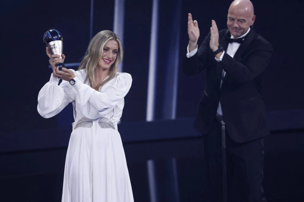 Es la segunda vez que la joven de 29 años elige llevar este estilo de vestido. Durante 2022, fue nombrada como mejor jugadora del año de la UEFA, y en este evento, también impactó con un diseño nupcial de Jesús Peiro. Esta pieza poseía un escote bandeau metalizado de lurex y un pantalón de seda con pinzas oversize. Por otro lado, había lucido joyas de VSB Joyeros, para sumarle a este look mucho más glamour.