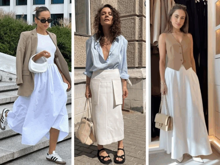 Para los días de calor intenso, un equipo blanco total es infalible. La fórmula: pollera blanca + remera básica o tank top. Si en la oficina el aire acondicionado está fuerte, sumá una camisa blanca abierta por encima. El resultado es fresco, pulido y muy fácil de replicar.