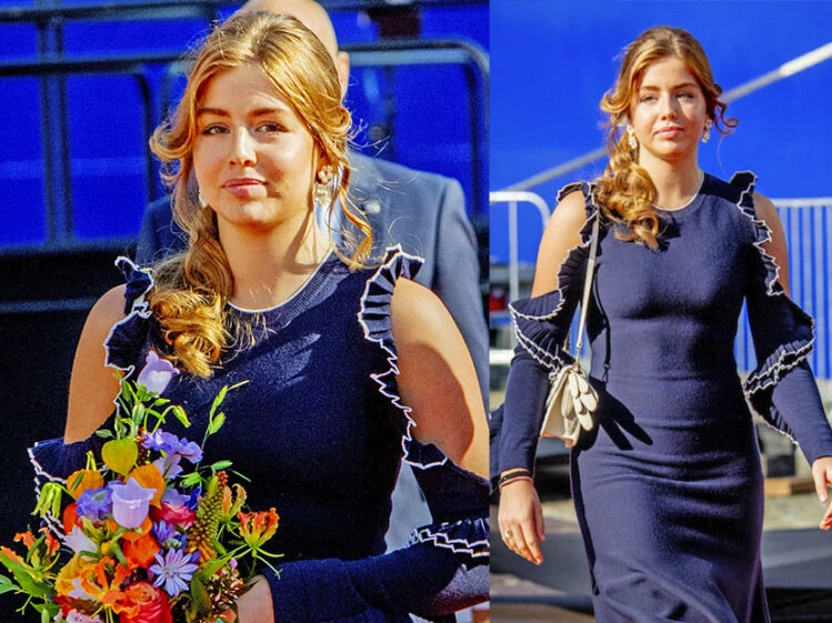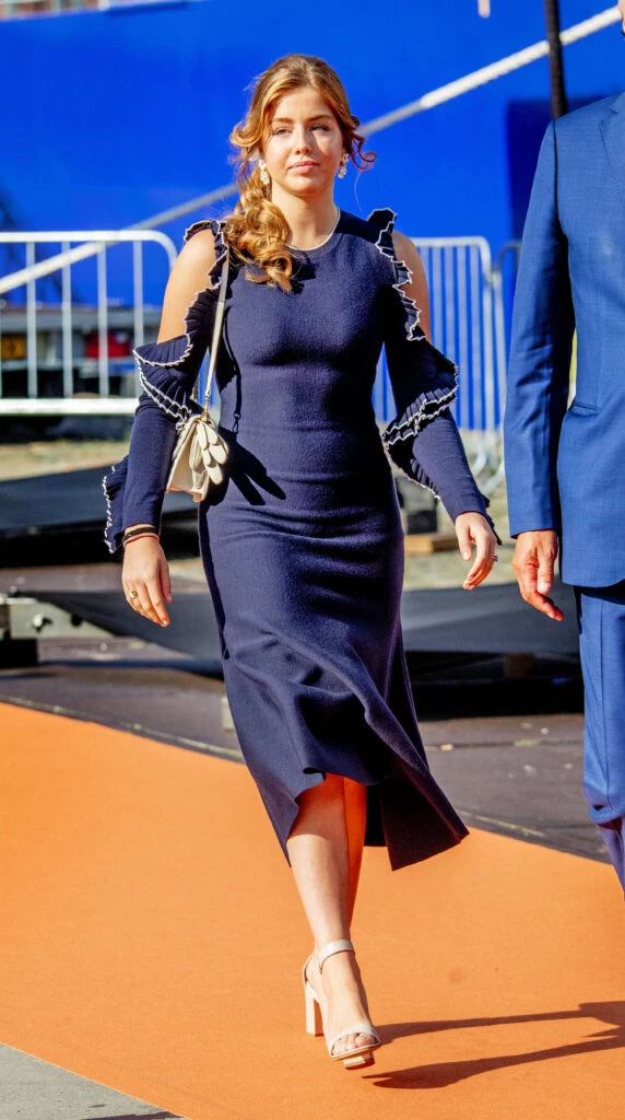 Bellísima, Alexia lució un vestido azul marino de Oscar de la Renta, realizado en tejido de punto, con detalles de abertura en mangas y volados con ribetes blancos, que pertenece a su madre, la reina Máxima.
