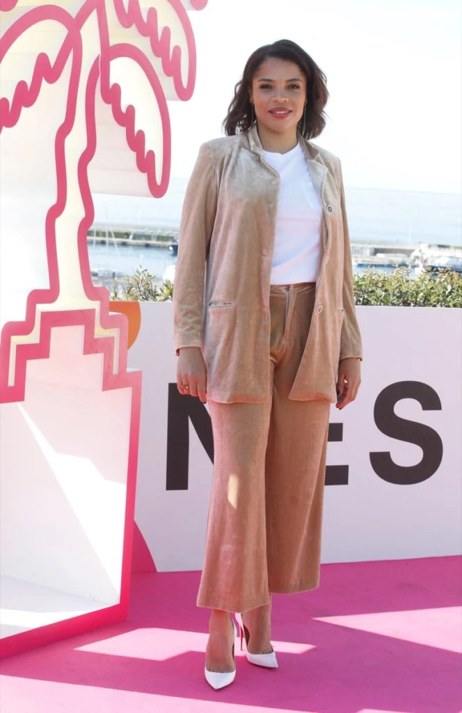 Súper canchera, la actriz francesa de "Marión" Louise Monot, adoptó un traje en color negro de saco cruzado con hombros destacados y cintura marcada y pantalón ancho. Para contra restar completó su look con zapatillas de color blanco.