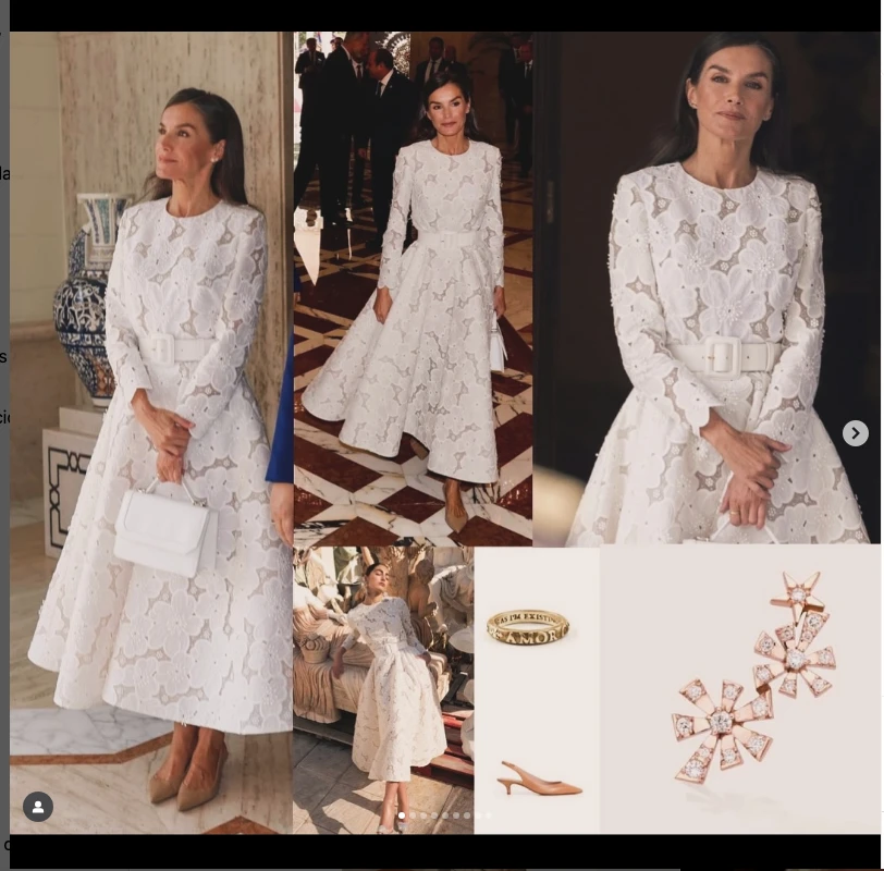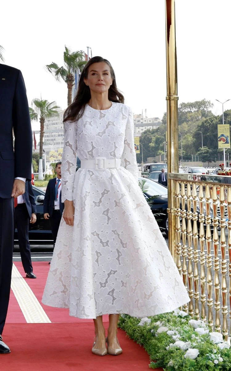 Para esta ocasión tan especial, Letizia volvió a demostrar su impecable sentido del estilo. La monarca eligió un vestido blanco de guipur de la firma española The 2nd Skin Co, con cuerpo entallado, cuello caja, mangas largas y falda midi con vuelo confeccionado en organza de seda natural.