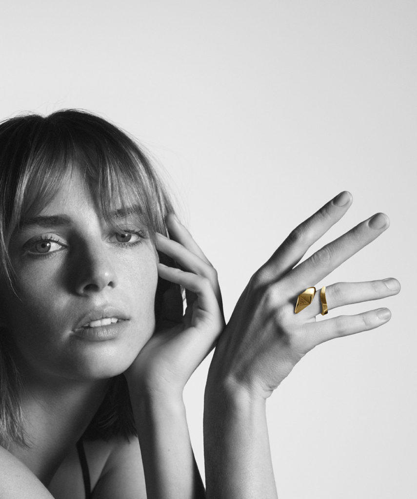 Bajo la dirección creativa de Fernando Verderi, las fotos fueron captadas por David Sims. Imágenes que ponen el foco en el dorado, protagonizadas por Amanda Gorman y Maya Hawke. Las piezas se destacan sobre las fotografías en blanco y negro de sus protagonistas. Un juego visual impactante.