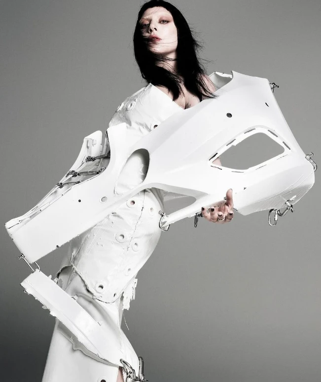 Lady Gaga sorprendió en la red carpet llevando un conjunto blanco inspirado en piezas de auto. Este vestido excéntrico con una mirada futurista. En concreto se trató de un corset strapless, una falda amplia con arandelas y un aplique en el torso, que la cantante definió en sus redes sociales: "En la alfombra roja dije que era una pieza de coche. Me preguntaron de qué tipo y yo dije no sé, no soy mecánica".