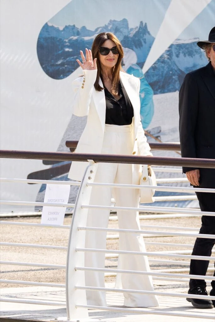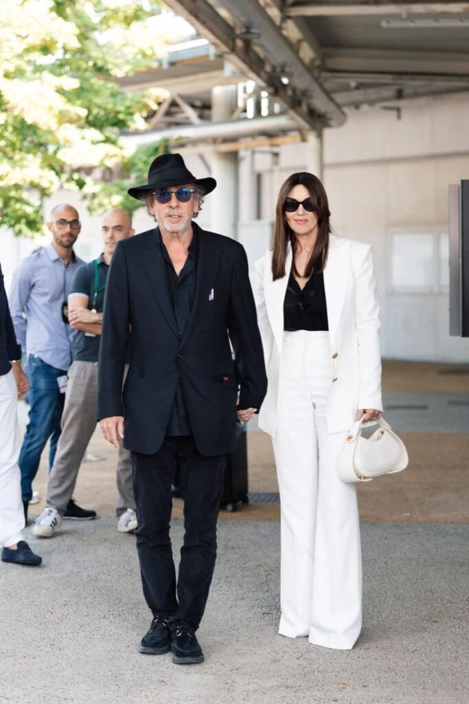 Monica Belluci fue una de las primeras en llegar y lo hizo de la mano de Tim Burton. La modelo italiana apostó por la sastrería y posó con un traje clásico de líneas rectas en color off white que presentaba elegantes botones dorados, y lo combinó una camisa en color negro a juego con unos anteojos de sol XL.