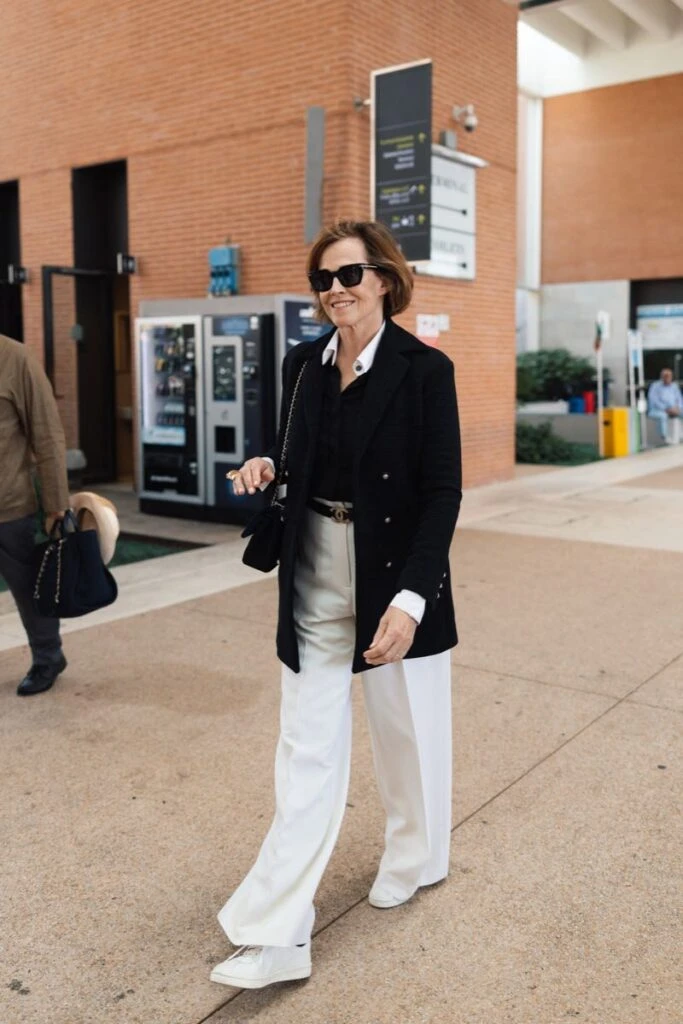 En cuanto al calzado, combinó su outfit con unas zapatillas náuticas en color blanco siguiendo la línea del pantalón, y así logró un efecto óptico muy chic que logra alargar la figura.
