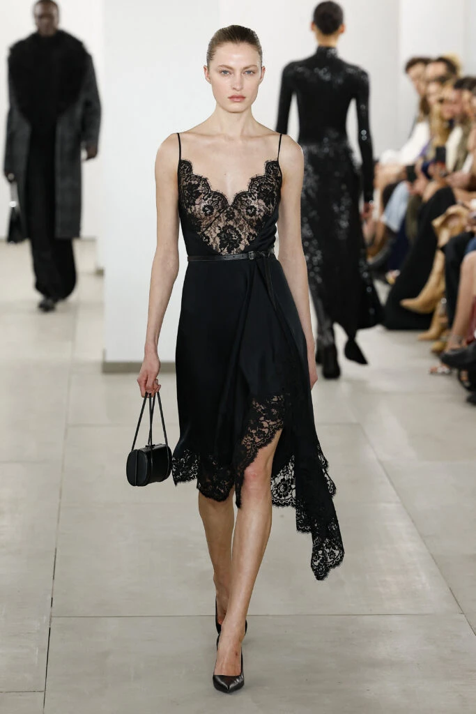 La joyita del desfile, fue un look que Kors describió riendo como "ambos abuelos", que combinaba una chaqueta negra de doble botonadura alargada sobre un vestido de seda negro hasta la rodilla con una cola dividida que estaba modelada sobre el vestido de novia que creó en inspiración a su abuela.