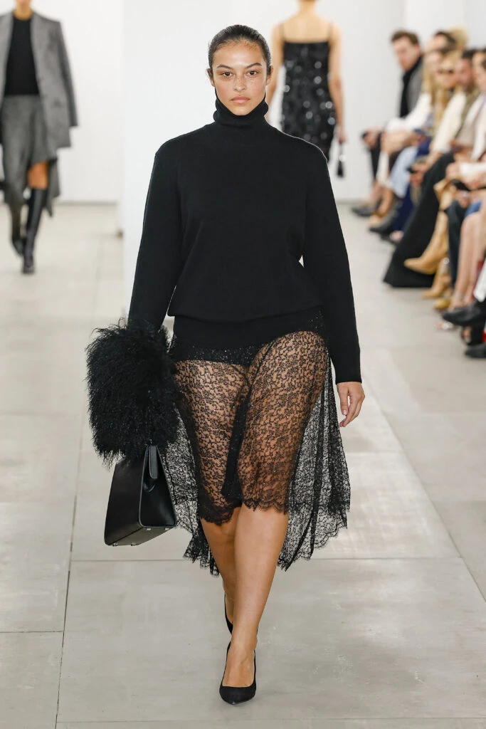 "Había una simplicidad en ella, tan chic. Es la cúspide de los años 30. Cuando mi mamá falleció durante el verano, estábamos revisando todo, y de repente vi esta bolsa para prendas, y la abrí y allí estaba". El diseñador neoyorquino está en su mejor momento, reelaborado clásicos estilos de la ciudad de Nueva York. Suéteres de cuello alto debajo de chaquetas ajustadas, o un buzo con capucha de lentejuelas, pero sin pantalones deconstruye el clásico look propuesto por anterioridad de Kors.