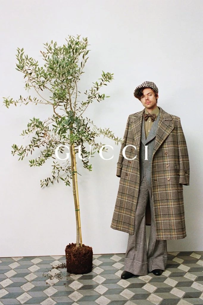 Styles, con sus uñas pintadas como siempre, posa junto a un árbol con un abrigo de cuadros Príncipe de Gales, descubre una silla con un traje de raya diplomática y se sienta en una montaña de ropa de la colección mientras usa un traje amarillo a cuadros salpicado de cerezas. Además se lo ve con su cartera favorita, la Gucci Bamboo 1947.