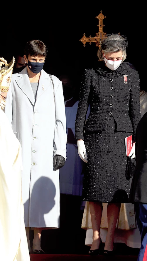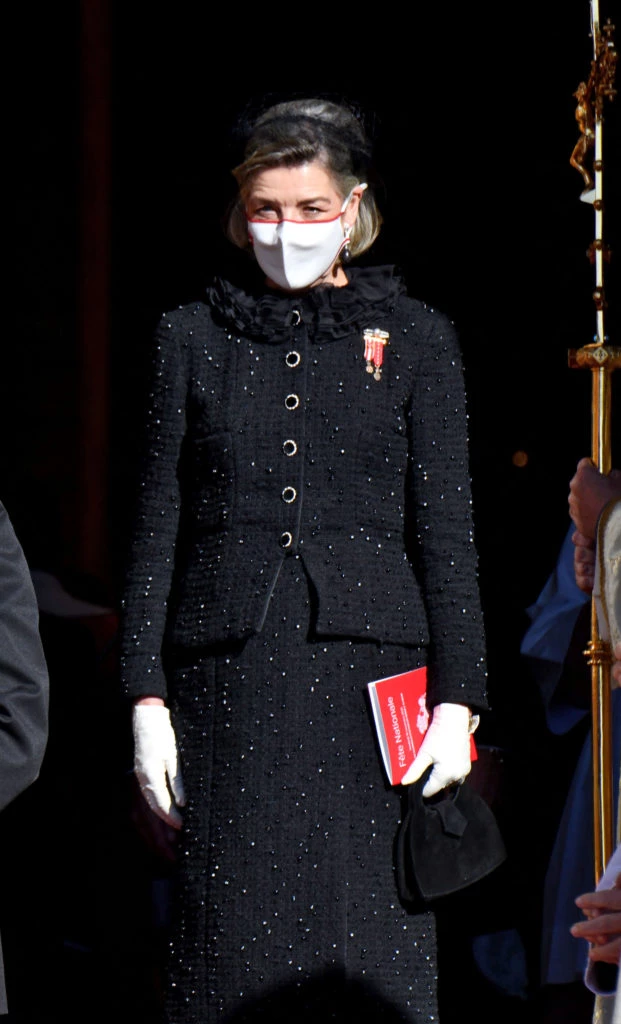 Carolina de Mónaco, siempre elegante y estilosa, se lució con un traje dos piezas confeccionado en tweed negro con bordados de pedrería, botones joya y detalles de tul en el escote perteneciente a la colección Pre-Fall 2021 de Chanel. Completó su look con un tocado de velo de red a tono y guantes blancos.
