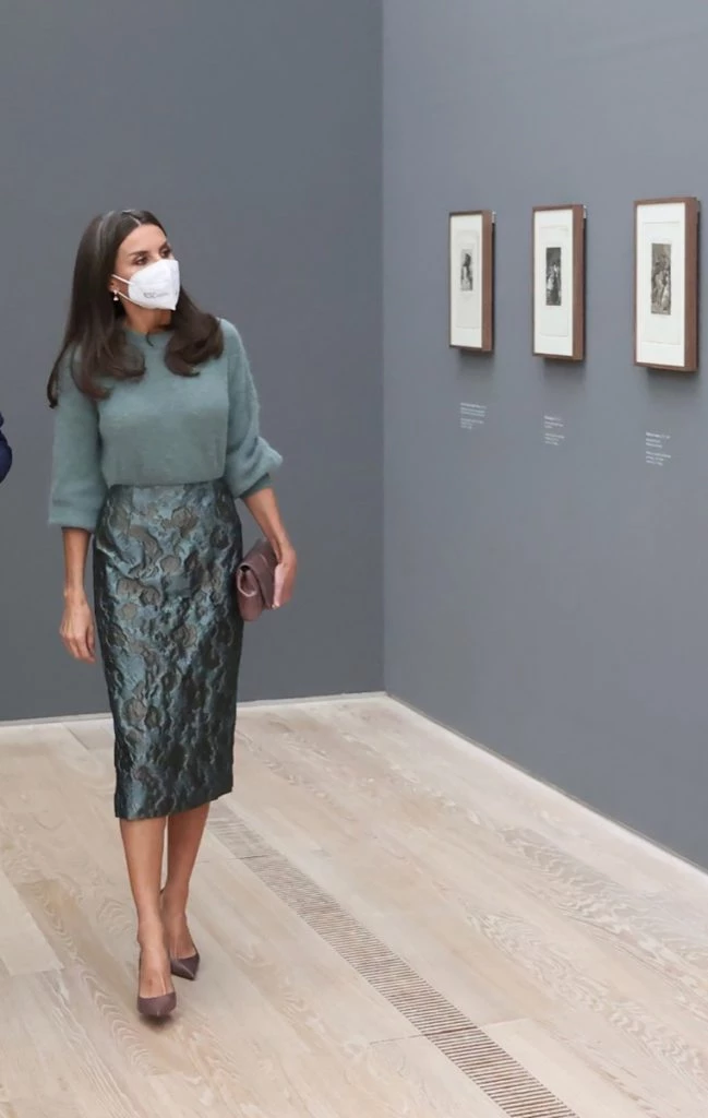 La monarca española optó por un conjunto en tonos de verde compuesto de un suéter grueso con mangas arremangadas para aportar modernidad, que llevó dentro de una falda tubo de brocato de largo midi, un clutch y stilettos al tono.