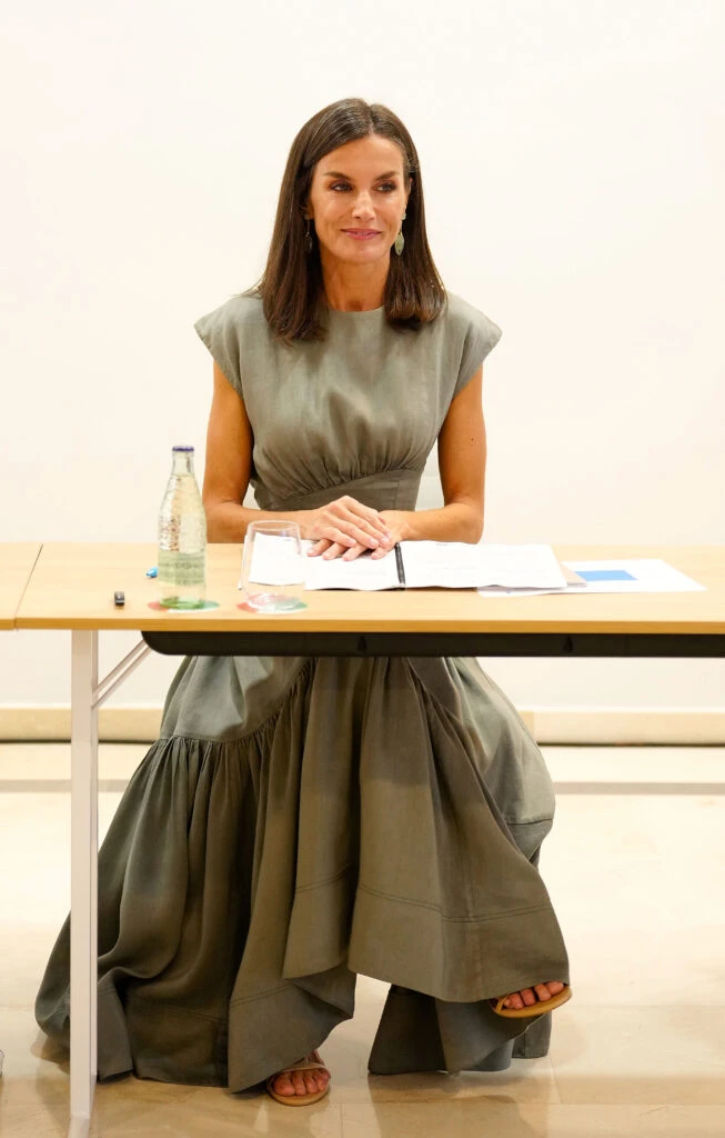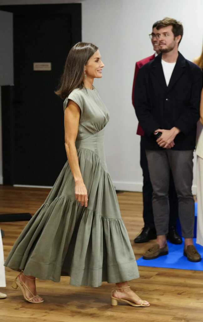 Letizia usó un vestido adquirido en la empresa española de alquiler de prendas y accesorios Lend the Label, fundada por Blanca Mayoral en plena pandemia. El modelo que eligió la royal es un vestido de lino en color verde tornasolado, escote redondo, manga corta y corte en la cintura. Se trata del modelo Hojae de la firma australiana Aje que tiene un precio original de 600 euros y se puede adquirir por 110 euros durante cuatro días.