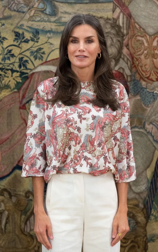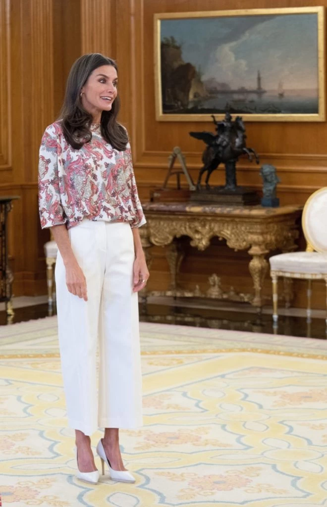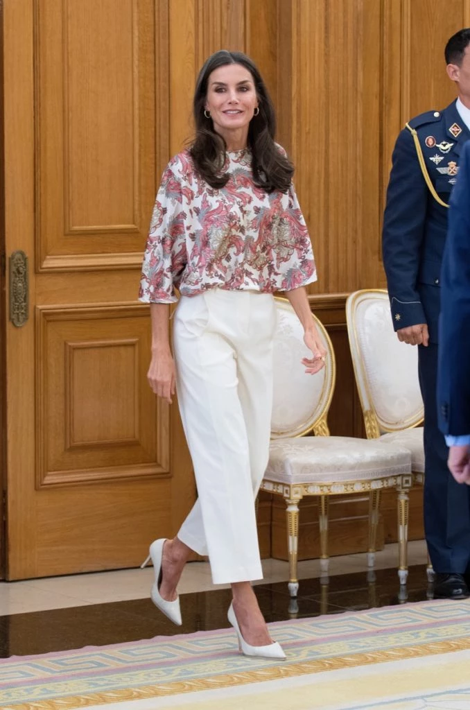 Letizia se lookeó con una blusa estampada