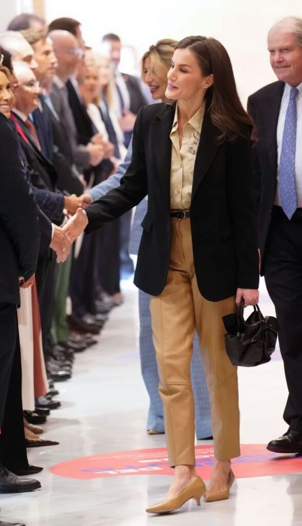 En concreto, la monarca adoptó un pantalón confeccionado un tejido de efecto piel y de un color camel, tan estiloso como perfecto. Para darle una impronta más elegante y moderna, lo combinó con una blusa de satén y un blazer en color negro.