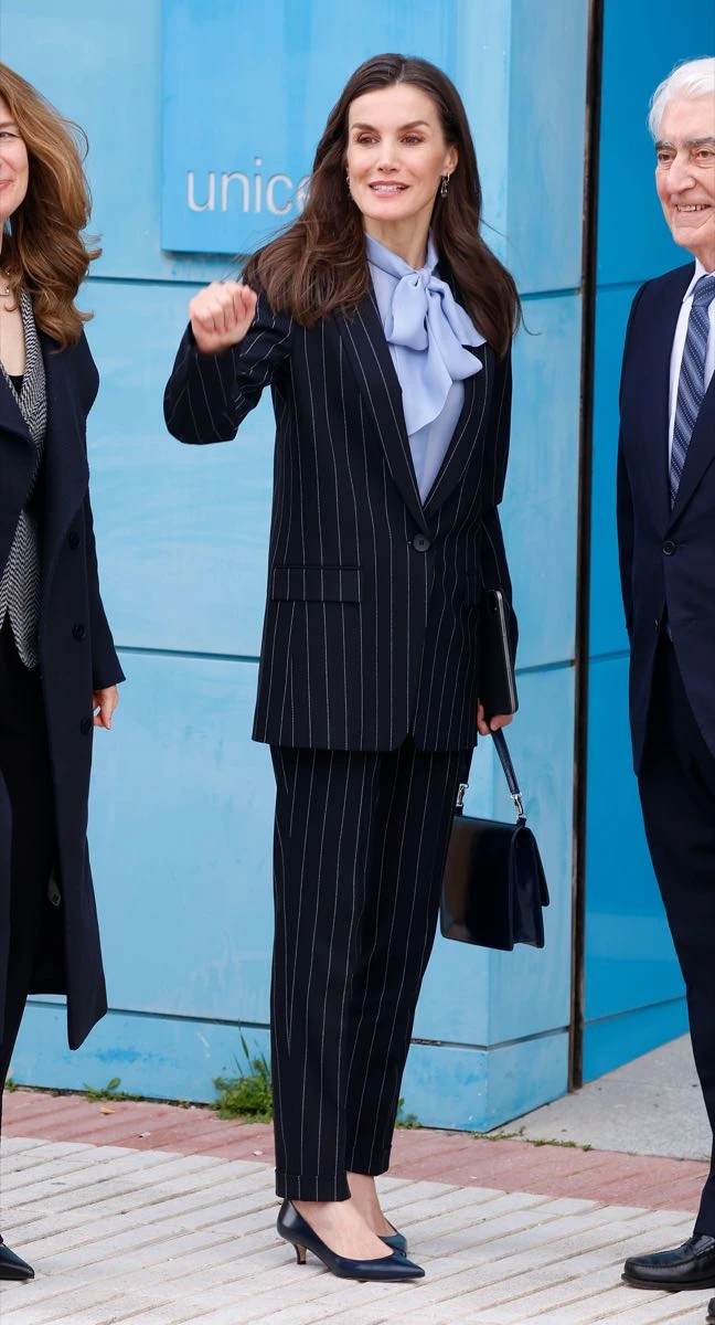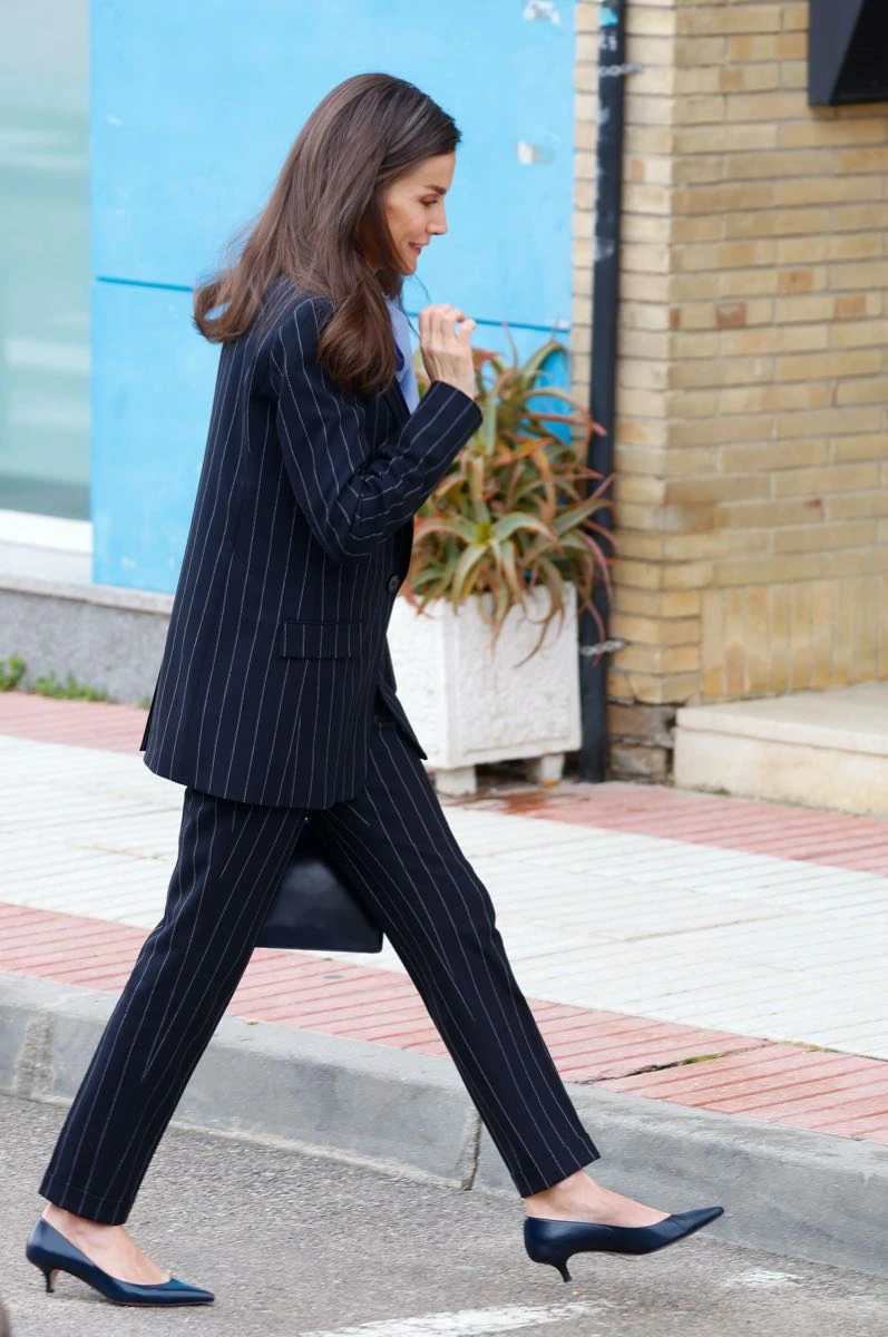 Para esta reunión, la monarca española apostó por un traje de saco y pantalón en raya diplomática en tono azul que ya lució en otras ocasiones. Se trata de un conjunto de Hugo Boss compuesto por un blazer semi entallado y un pantalón recto.