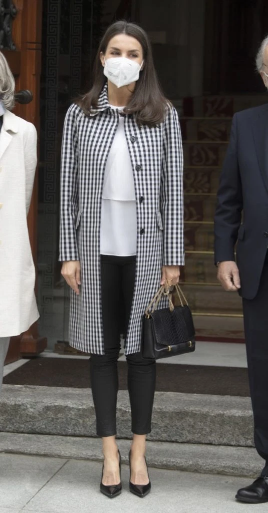 Para la jornada de hoy, la monarca eligió un look bicolor con prendas comodines y de tendencia.