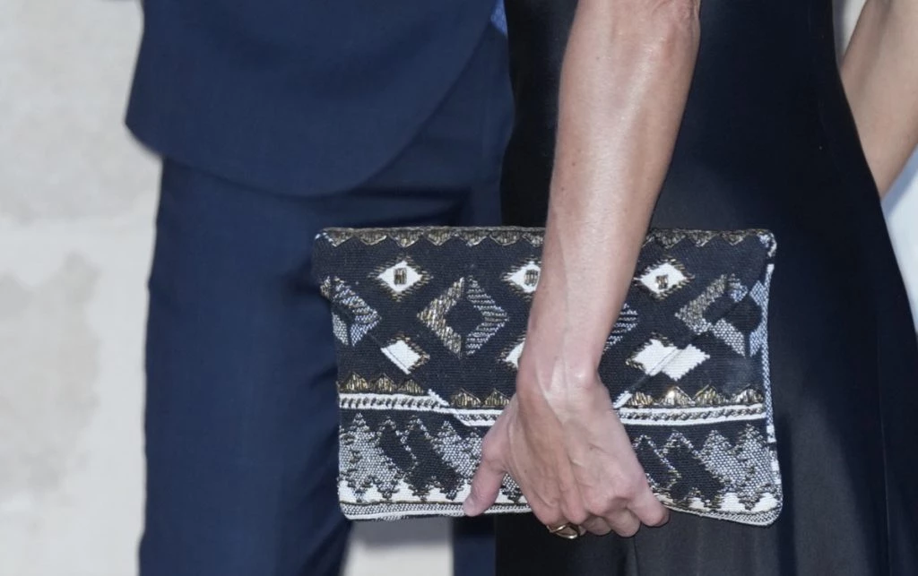 Remató su espectacular look con unos aros brillantes y un clutch de mano de Mango con motivos étnicos ideal para las noches de verano como esta. Por supuesto, también llevó su inseparable anillo dorado de Karen Hallam, regalo de sus hijas.