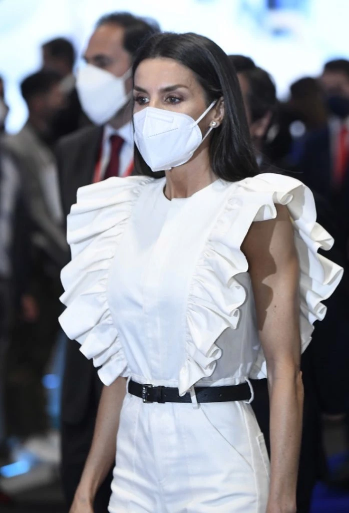 La reina deslumbró con su outfit: en lugar de reciclar algo que ya había usado, tal como hace frecuentemente, estrenó un mono de algodón blanco que tiene la particularidad de llevar el ítem de moda de la próxima temporada. Sí, porque los volados son tendencia e invaden blusas de manera exagerada.