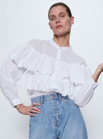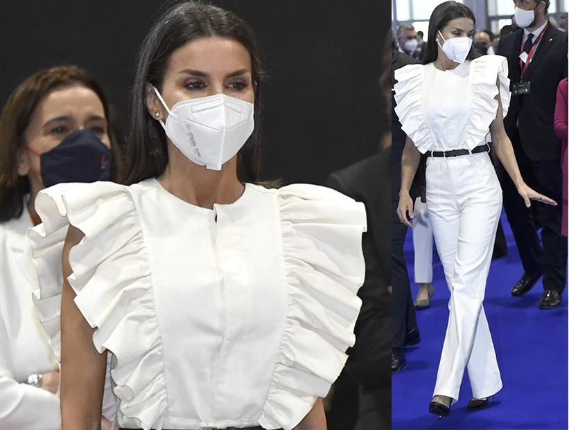 La reina deslumbró con su outfit: en lugar de reciclar algo que ya había usado, tal como hace frecuentemente, estrenó un mono de algodón blanco que tiene la particularidad de llevar el ítem de moda de la próxima temporada. Sí, porque los volados son tendencia e invaden blusas de manera exagerada.