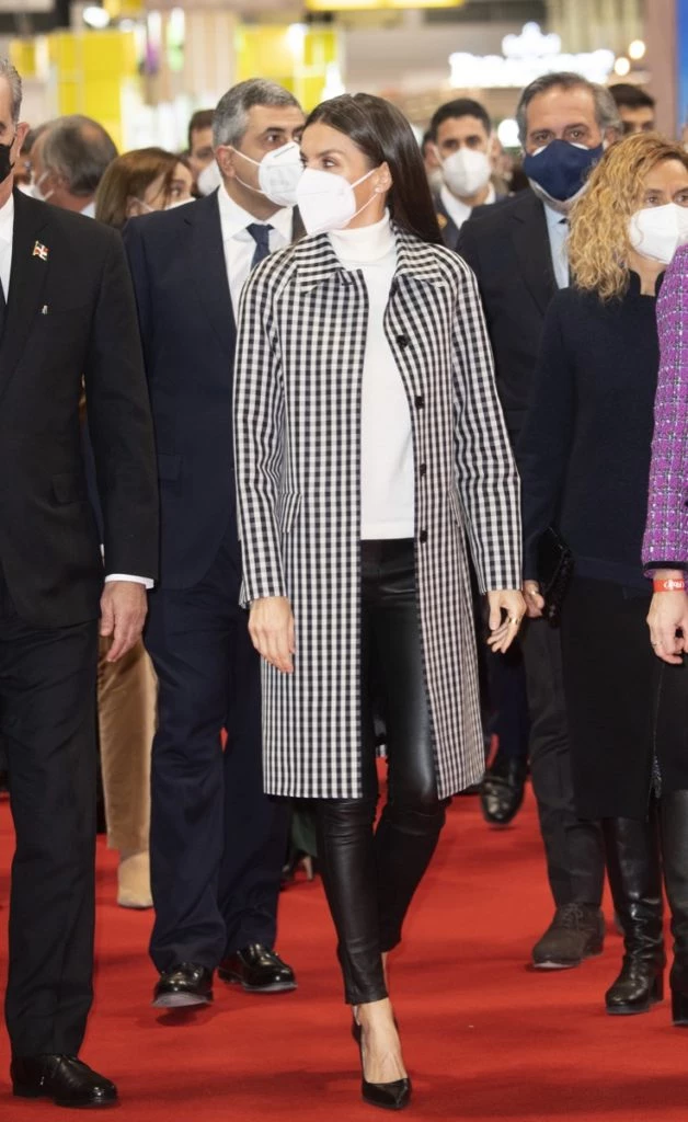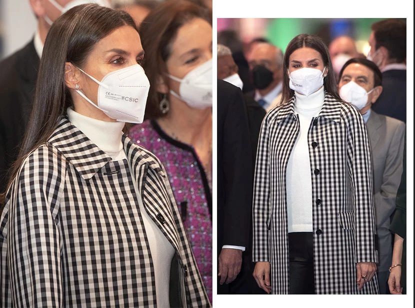 Como pieza central de su look, Letizia adoptó un abrigo recto tipo gabardina con estampado de cuadros vichy en blanco y negro, muy de tendencia para el invierno 2022. Un diseño con acabado waterproof y largo a la rodilla de la firma española Mirto.
