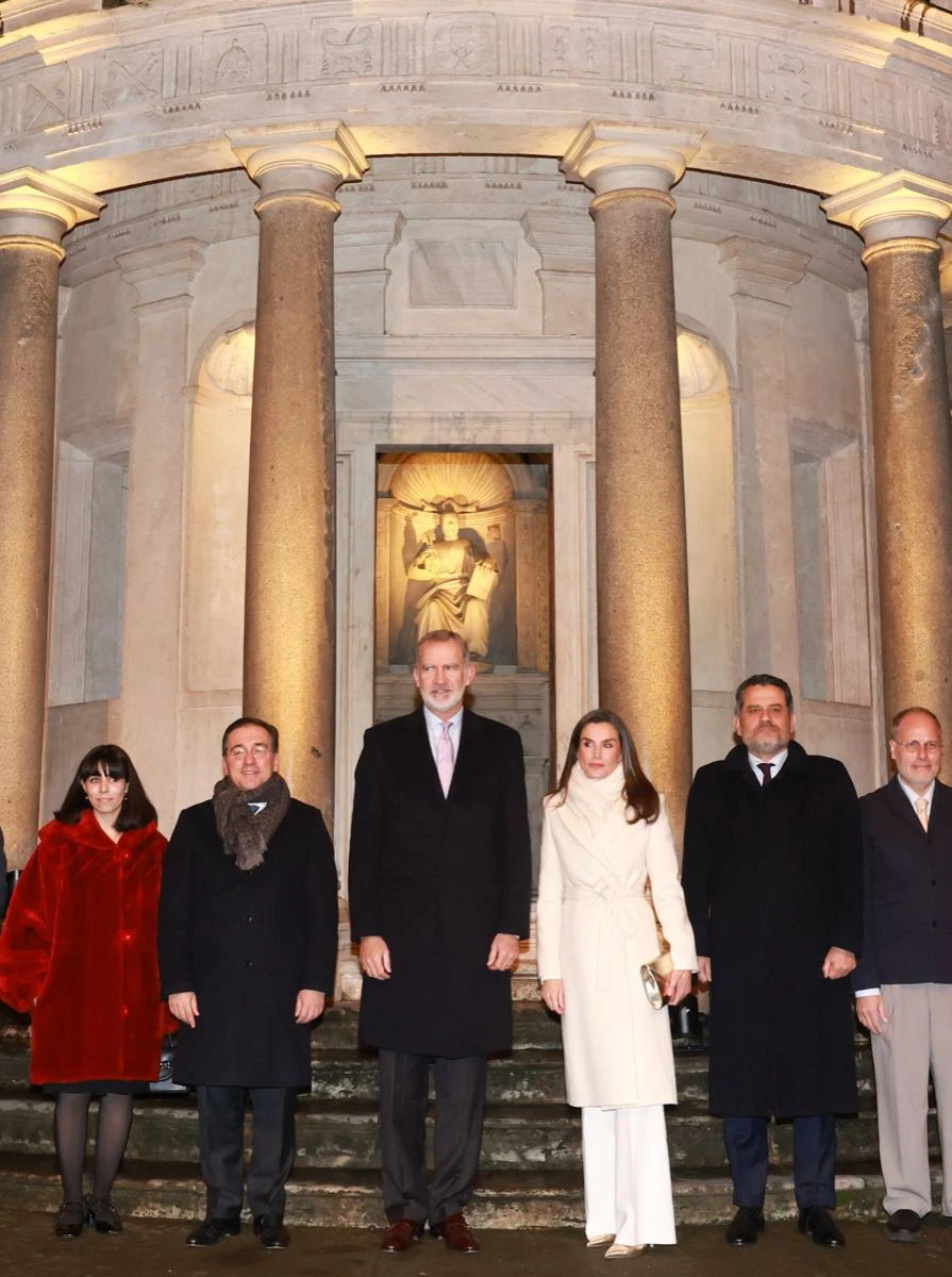 En el primer acto de la agenda, Letizia impactó con su look luminoso, elegante y muy sofisticado. Primero, recurrió a uno de sus abrigos favoritos de Felipe Varela, un diseño cruzado, con gran solapa, largo a la rodilla y lazo para envolver su cintura.