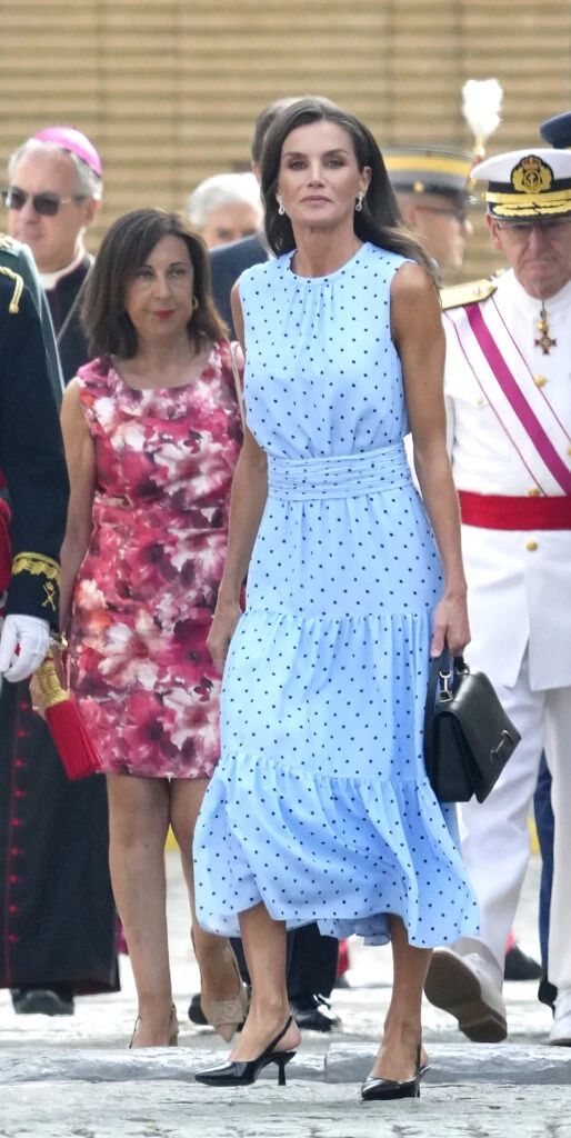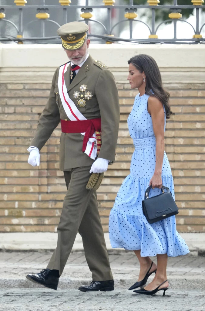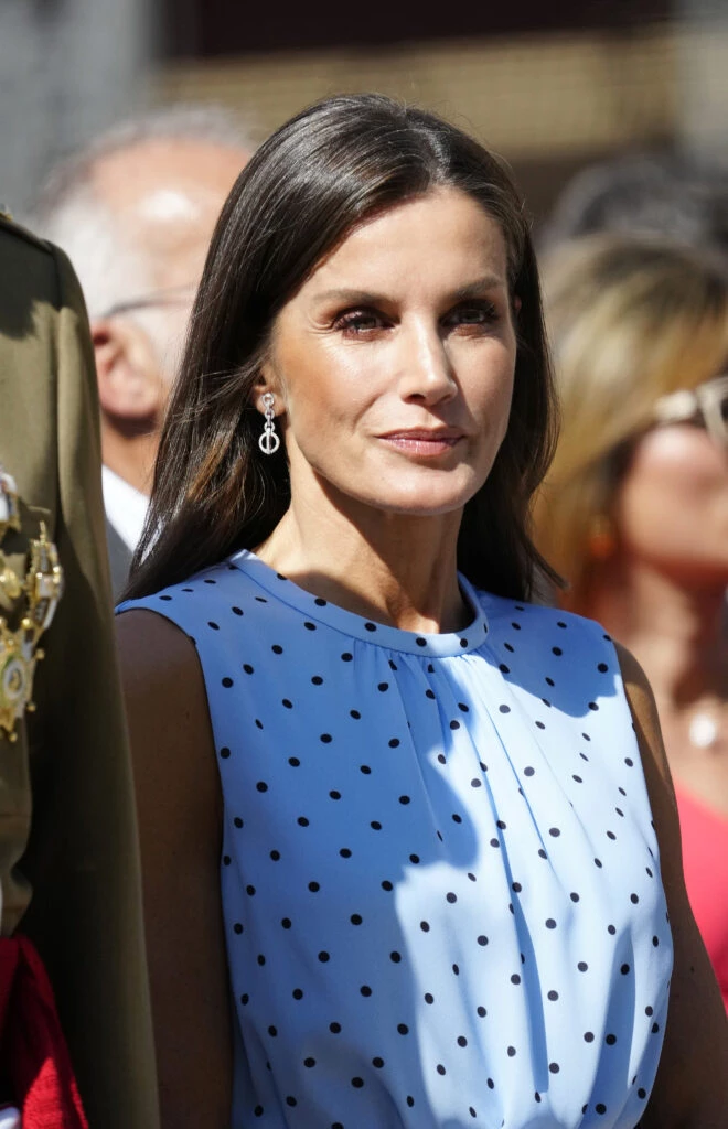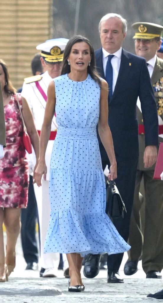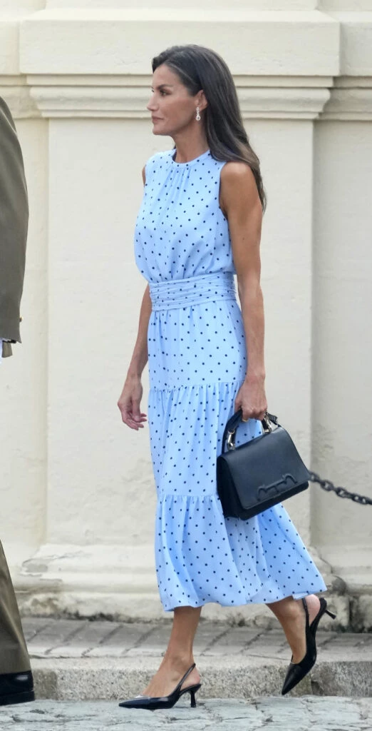 Fue para la jura de la bandera de su hija mayor, la princesa Leonor, que está formándose en la Academa MIlitar de Zaragoza, que Letizia usó este vestido de la firma española & Me Unlimited, cuya ropa se crea a partir de materiales reciclados. Confeccionado en seda de color celeste con lunares, el diseño tiene cintura marcada y falda de tres volados y largo midi.