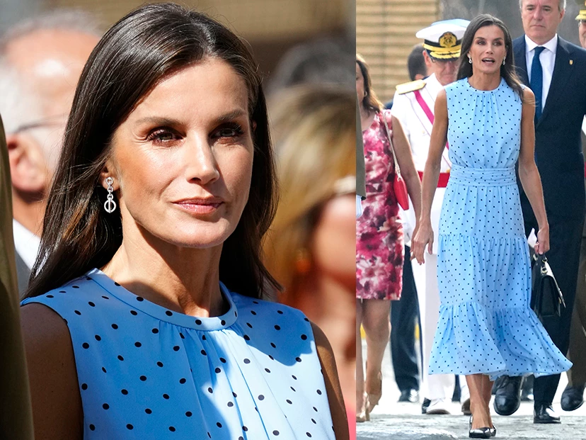 Fue para la jura de la bandera de su hija mayor, la princesa Leonor, que está formándose en la Academa MIlitar de Zaragoza, que Letizia usó este vestido de la firma española & Me Unlimited, cuya ropa se crea a partir de materiales reciclados. Confeccionado en seda de color celeste con lunares, el diseño tiene cintura marcada y falda de tres volados y largo midi.