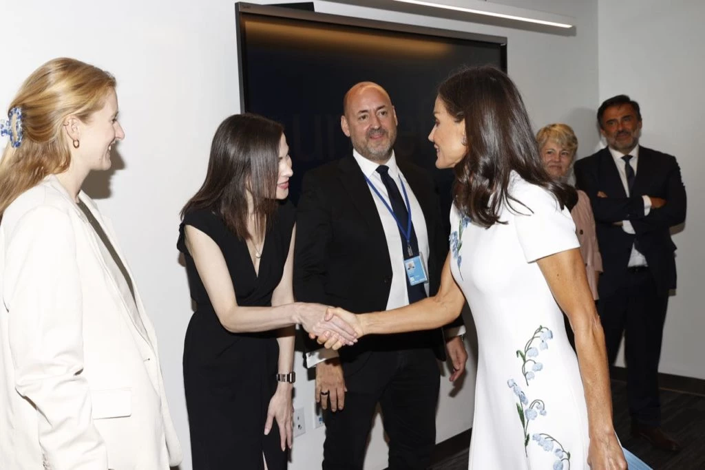 En otra de las jornadas, la reina llevó un vestido rojo de Zara, elaborado en colaboración con el diseñador Narciso Rodríguez. Se trata de un diseño con mangas sisa y un cuello subido con un original doblez, largo a la altura de la rodilla y tiene favorecedores drapeados que ajustan el vestido a la cintura y la definen.