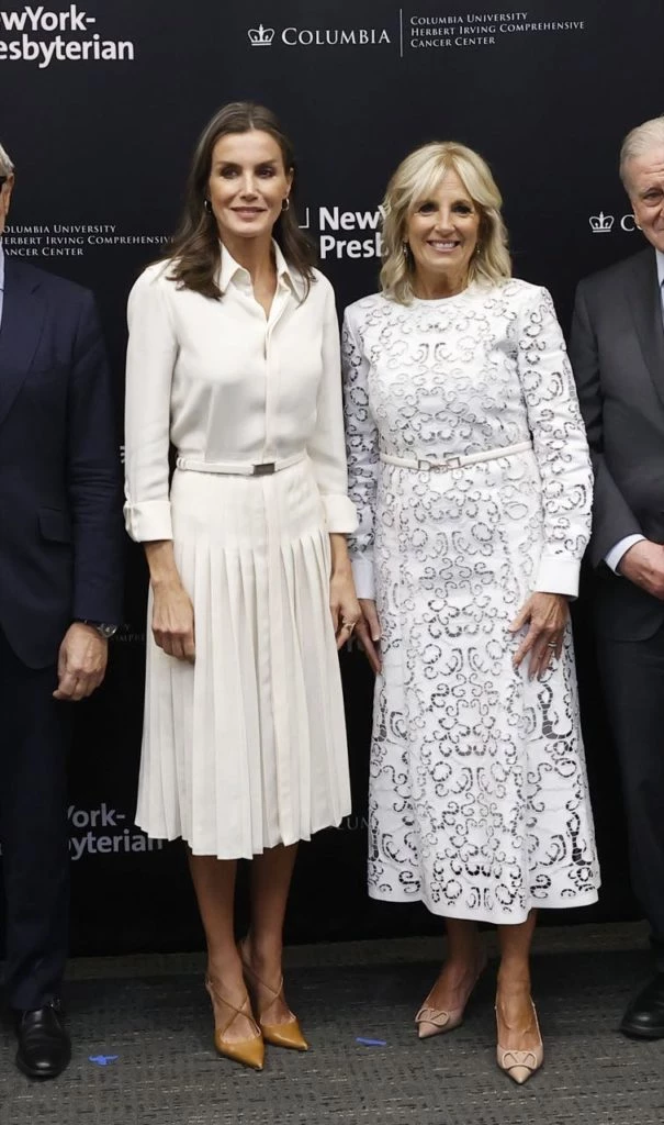 Letizia Ortiz causó alto impacto con sus elegantísimos looks en su gira por los Estados Unidos. En una de las jornadas, la reina de España lució un vestido blanco camisero de Ralph Lauren en su encuentro con Jill Biden, la primera dama del país del norte. El vestido tiene una parte superior con camisa de cuello inglés, botones de nácar y mangas largas, y una falda plisada de largo midi, que la reina llevó con un cinturón del mismo género.