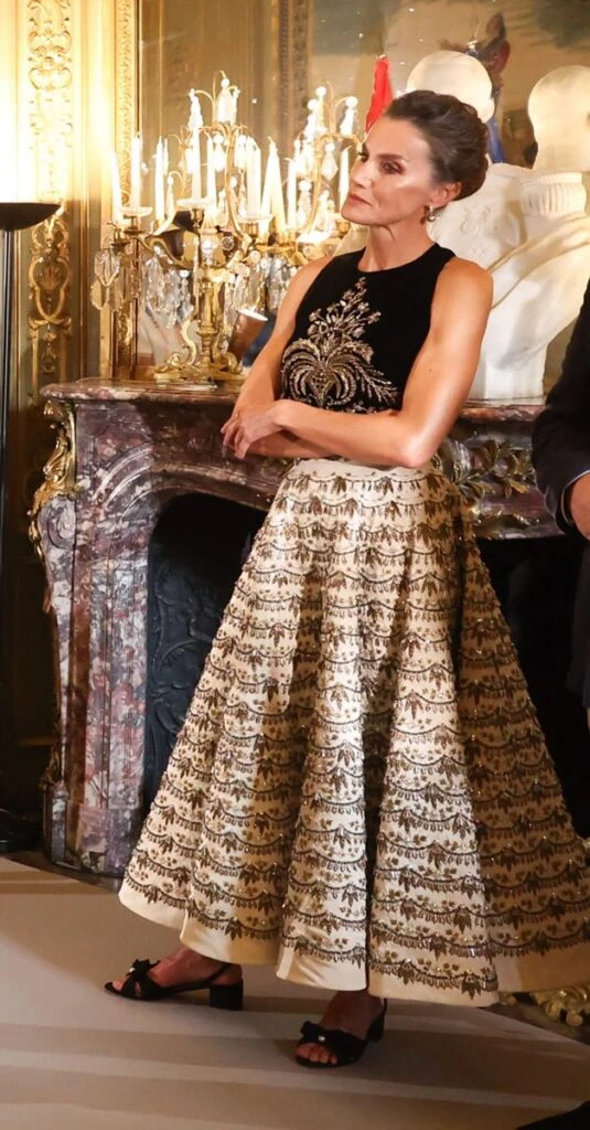 En esta ocasión, la royal española deslumbró con su estilismo firmado por una marca francesa, Dior. La pieza pertenece a la colección de alta costura primavera verano 2023/24 y presenta una construcción conformada por un top negro sin mangas con apliques y bordados florales y una maxifalda de seda en tono crudo de talle alto y corte acampanado, también decorada a partir de incrustaciones.