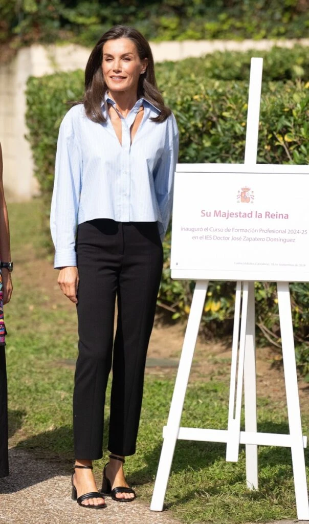 Letizia Ortiz sorprendió este miércoles cuando asistió a la apertura del Curso de Formación Profesional en el ÍES "Doctor José Zapatero Domínguez", con un look clásico pero con toques muy fashionistas.