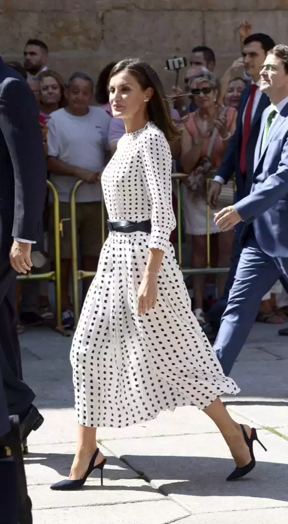 Para esta ocasión, la reina de España recurrió al vestido más versátil y femenino de todos su guardarropas: un vestido de manga larga en color blanco, estampado con pequeños cuadrados en azul marino.