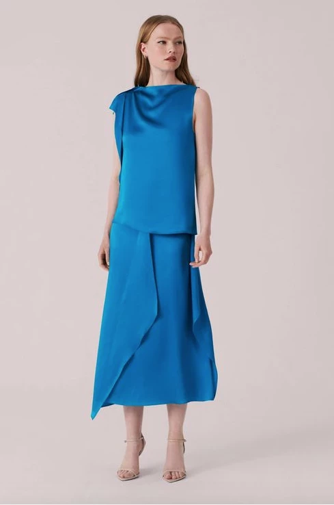La monarca sorprendió con un conjunto confeccionado 100% en seda natural de top sin magas asimétrico y pollera midi con vuelo.