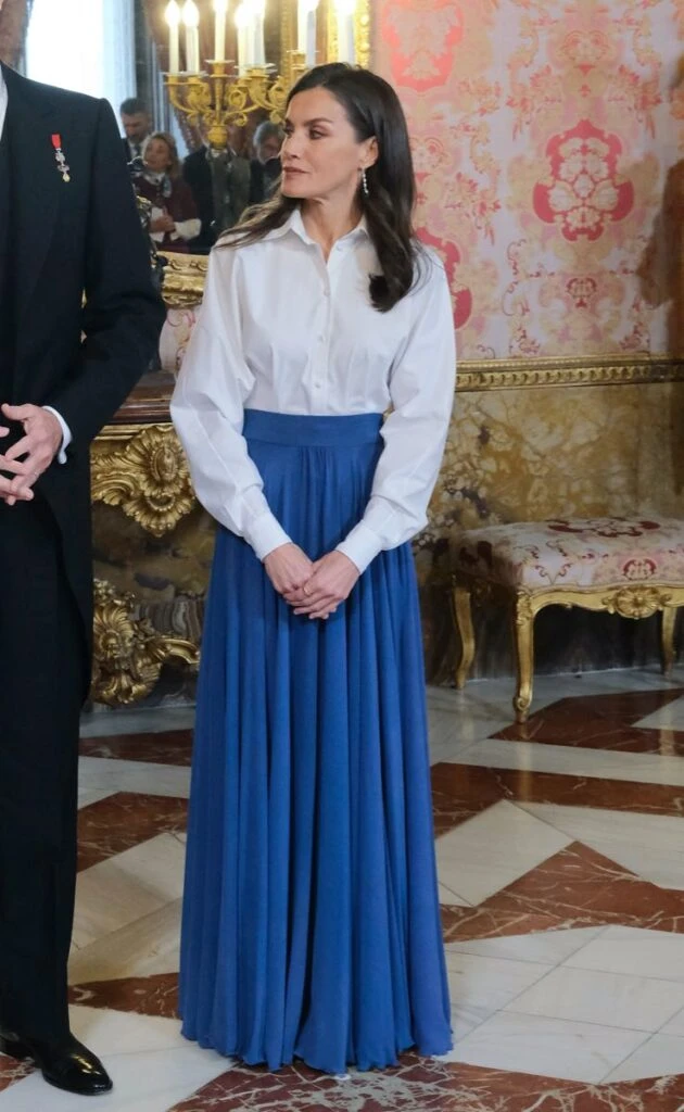 En esta ocasión, la royal española adoptó una camisa clásica blanca de mangas tipo globo con puños cerrados y una pollera larga de gasa en color azul. En cuanto al calzado, llevó unos stilettos en un tono azul marino, de Carolina Herrera.