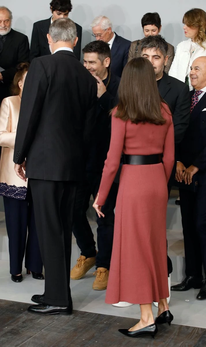 La esposa del rey Felipe VI lució un vestido de la firma de San Sebastián INDI&COLD. Un diseño de color marsala, es decir, entre rojo, marrón y bordó, este vestido está confeccionado en punto acanalado y presenta mangas largas con pequeña abertura en el puño, falda evasé con abertura lateral y corte entallado en la cintura.