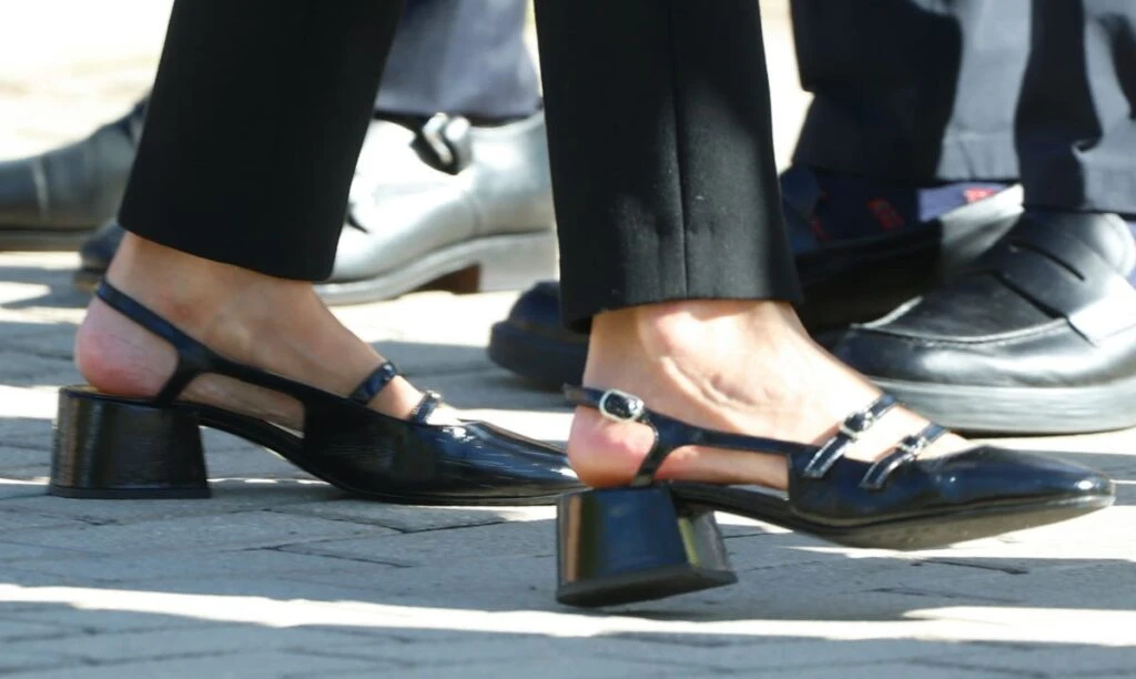 La Reina de España completó su estilismo con pantalones tobilleros de corte recto en negro y zapatos de charol de la firma francesa Sézane, un modelo con doble tira al empeine que combina comodidad y elegancia. Un conjunto en clave ejecutiva que inaugura la temporada de otoño con equilibrio perfecto entre sobriedad y tendencia.