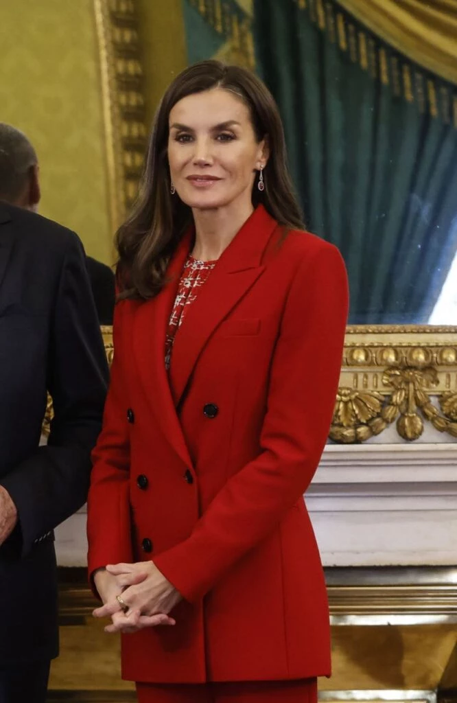 Letizia rescató de su armario uno de sus trajes favoritos. Se trata de un dos piezas de saco y pantalón en color rojo de la firma Hugo Boss.