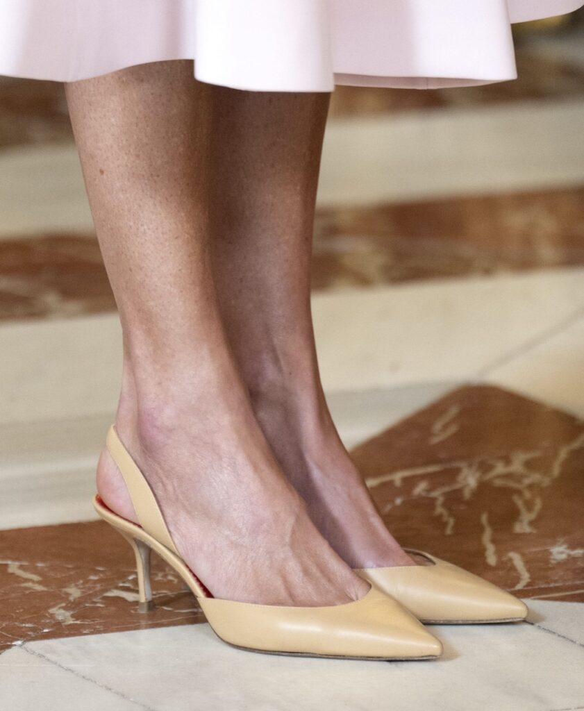 Letizia completó su estilismo con unas mules destalonados en color nude. Respecto a las joyas, sin sorpresas, llevó su anillo de Coreterno y aros de Gold&Roses.