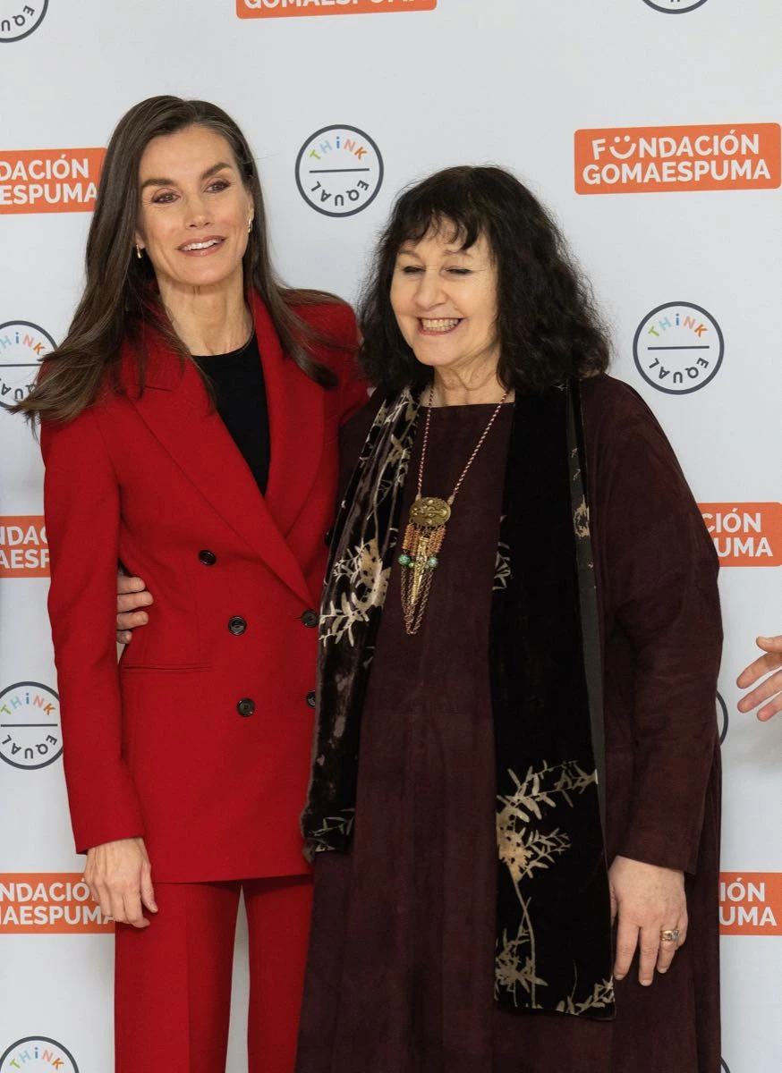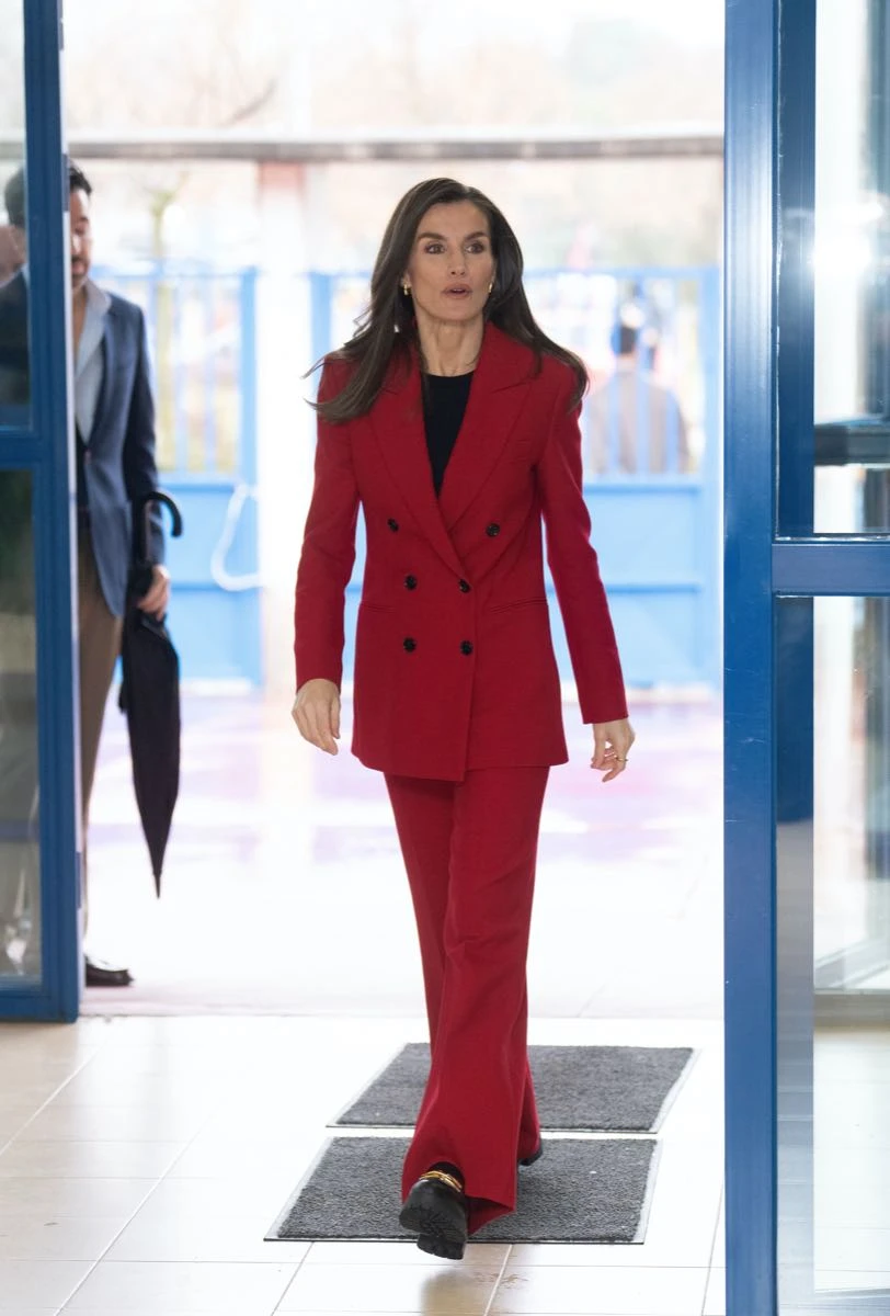 En su look, la monarca apostó por la comodidad y sencillez de un traje de saco y pantalón en un vibrante color rojo de Hugo Boss y lo accesorizó con piezas claves para modernizarlo: por un lado, los aros gota y en los pies unos mocasines con suela chunky.